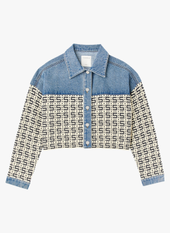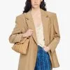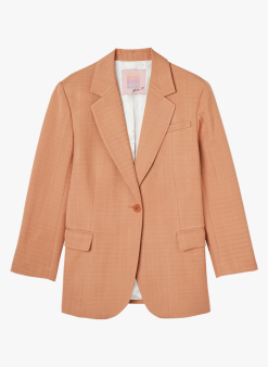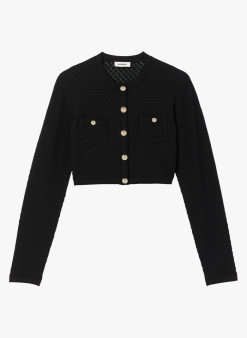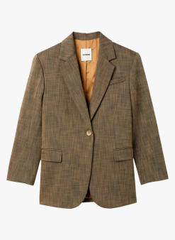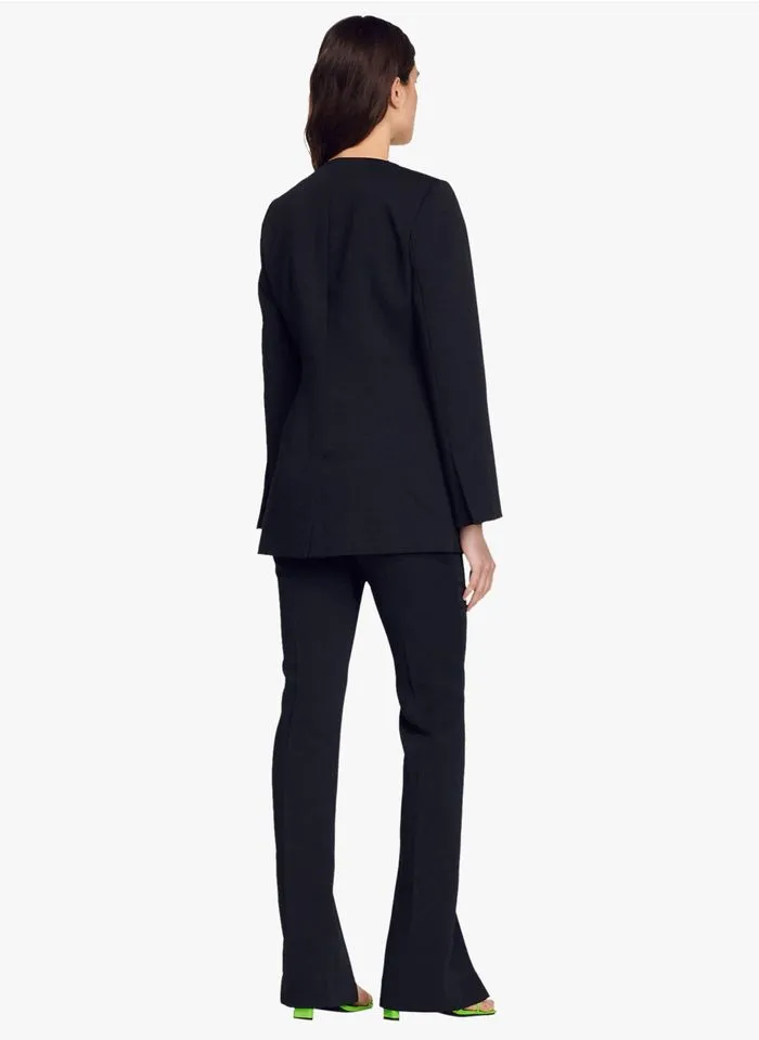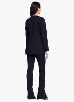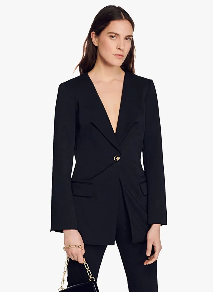 - Veste cintrée et drapée, munie d’une encolure en V, de poches horizontales à rabat et de manches longues.