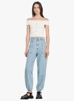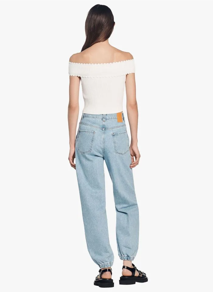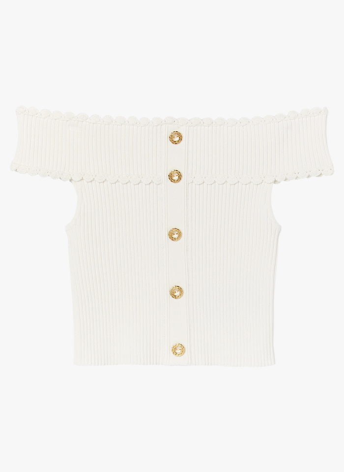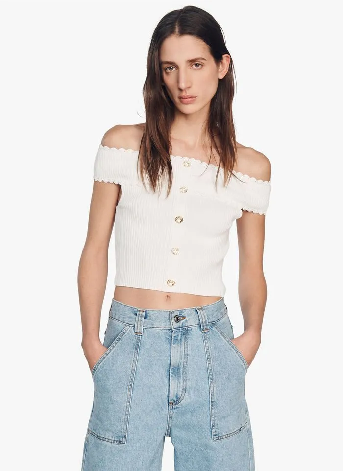 - Top en maille à épaules dénudées, orné de boutons sur le devant et muni de manches courtes.