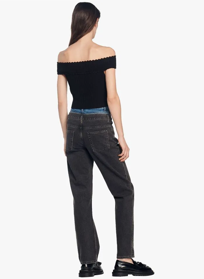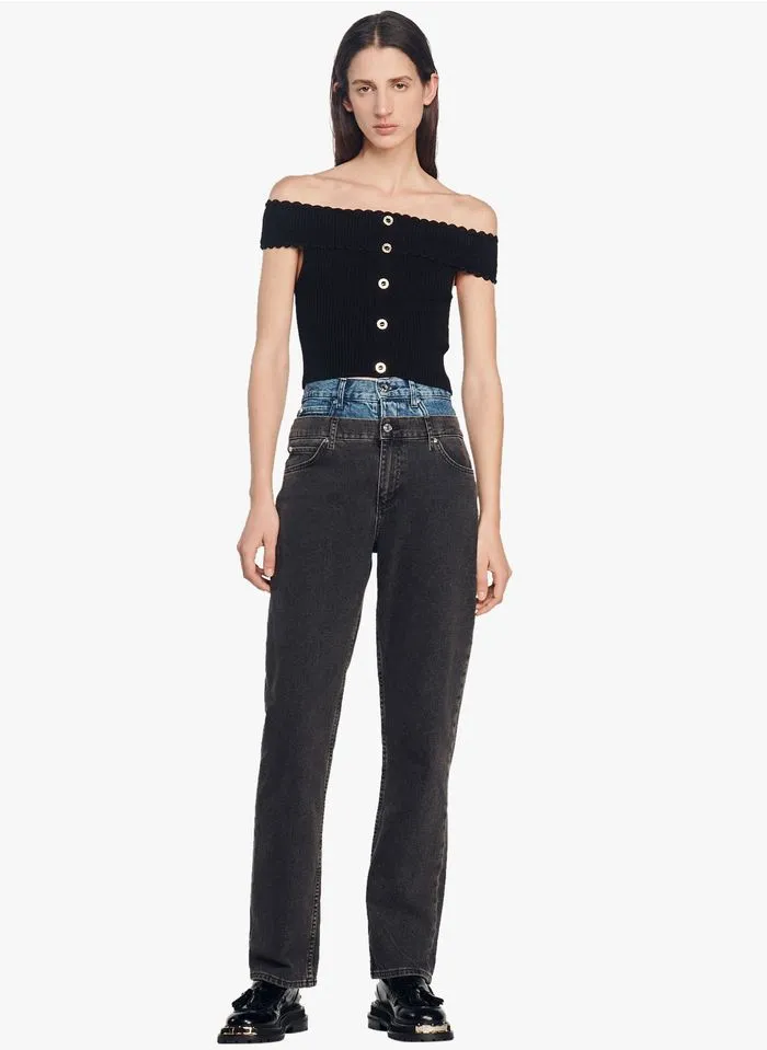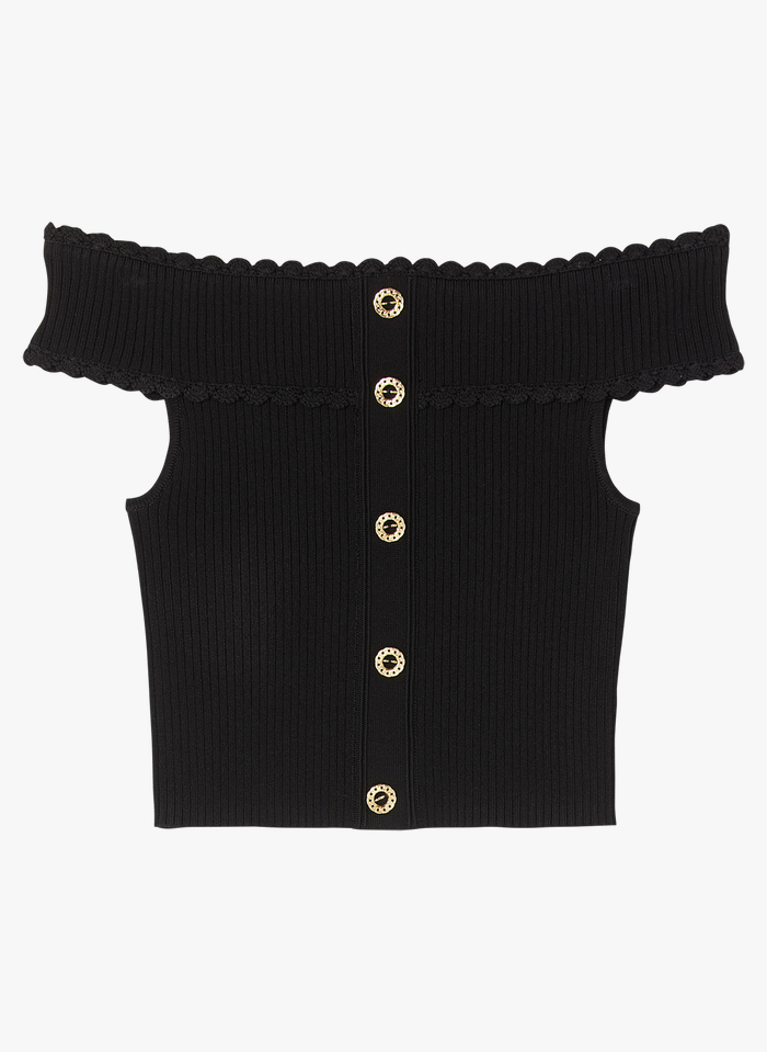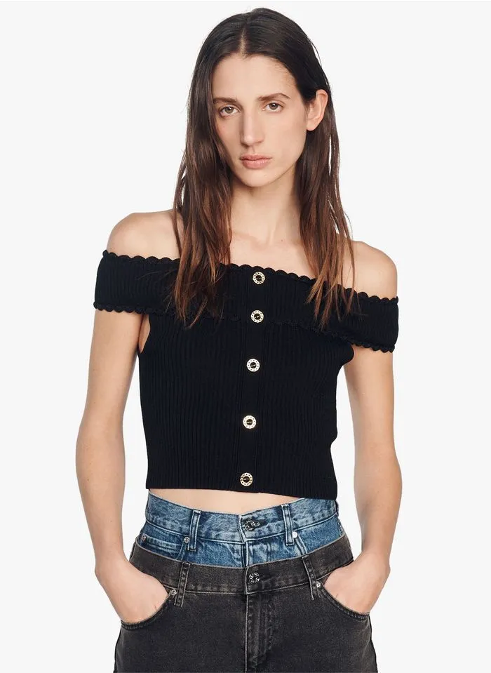 - Top en maille à épaules dénudées, orné de boutons sur le devant et muni de manches courtes.