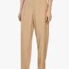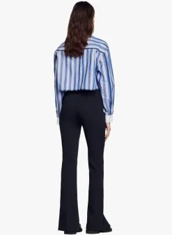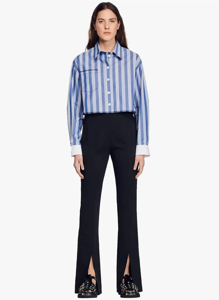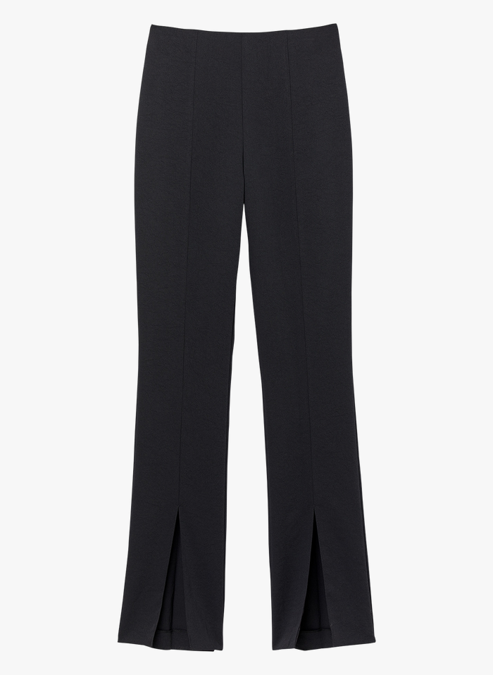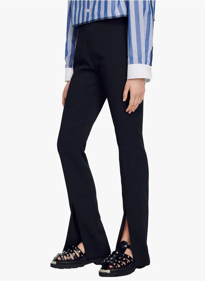 - Pantalon taille haute à jambe évasé, muni d’une découpe verticale sur la jambe et d’une fente sur le bas.