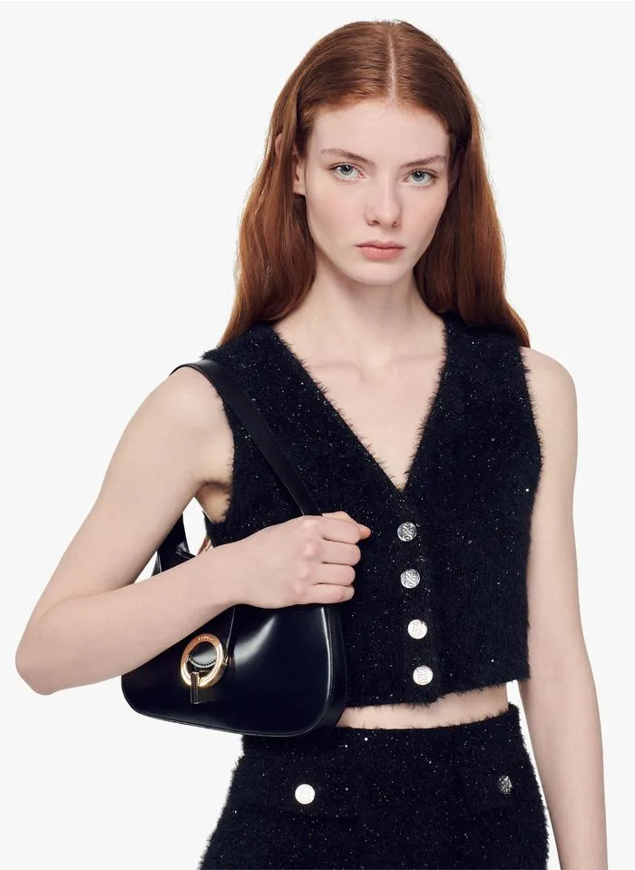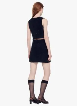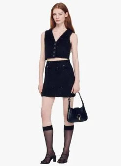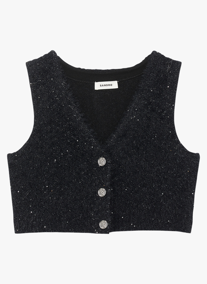 - Brassière en tweed pailleté, sans manches, munie de boutons fantaisie et d’un col en V.