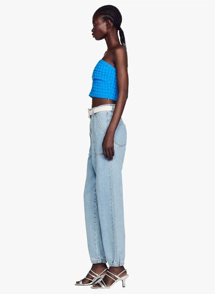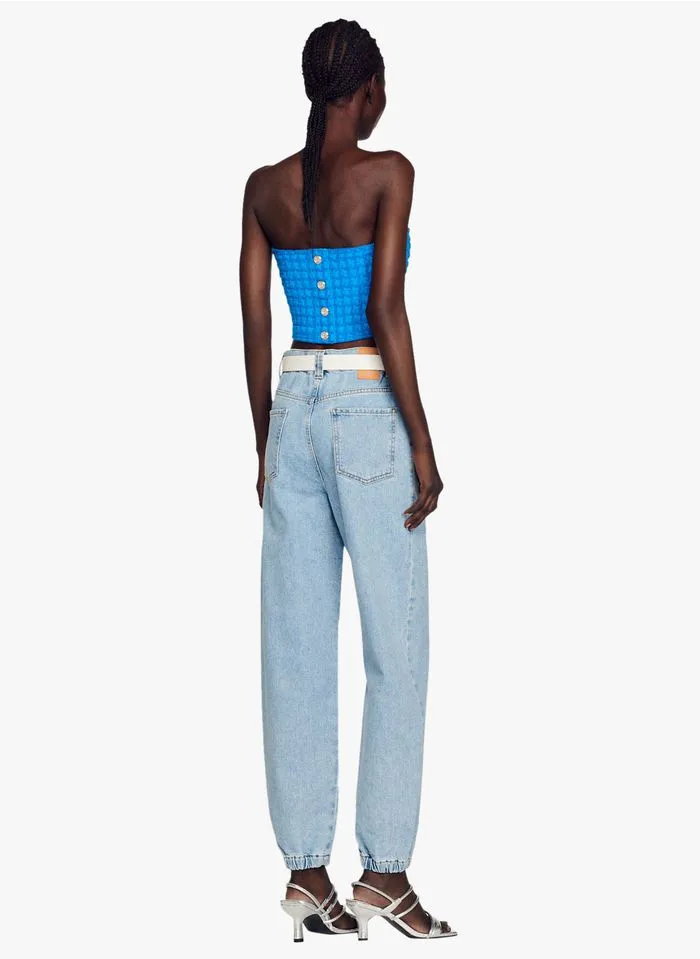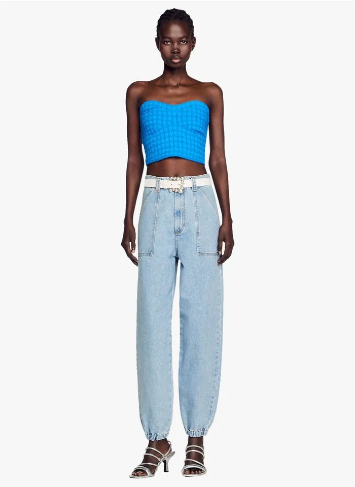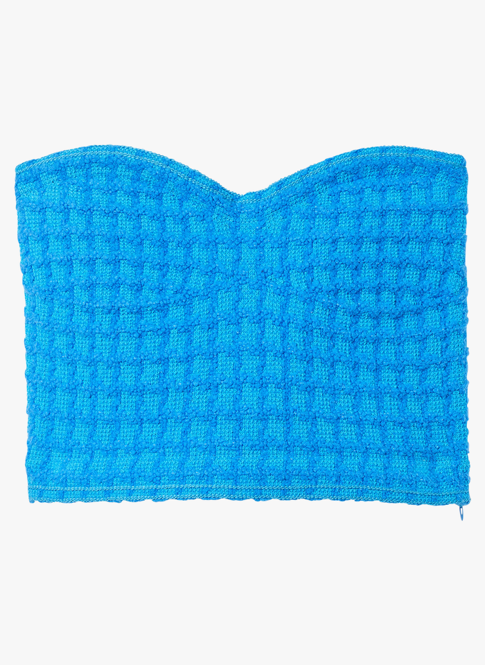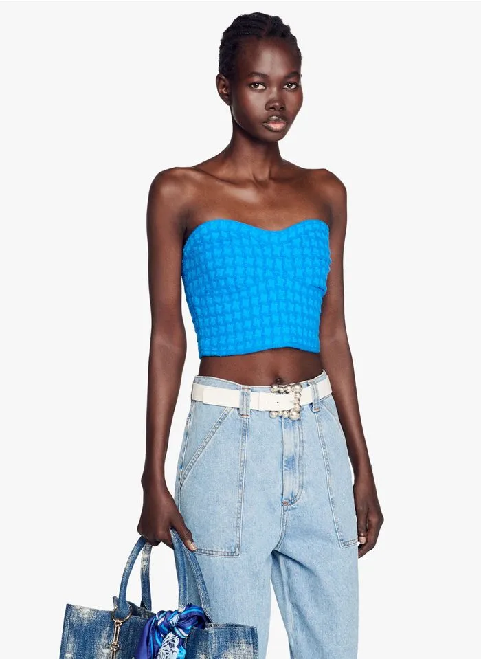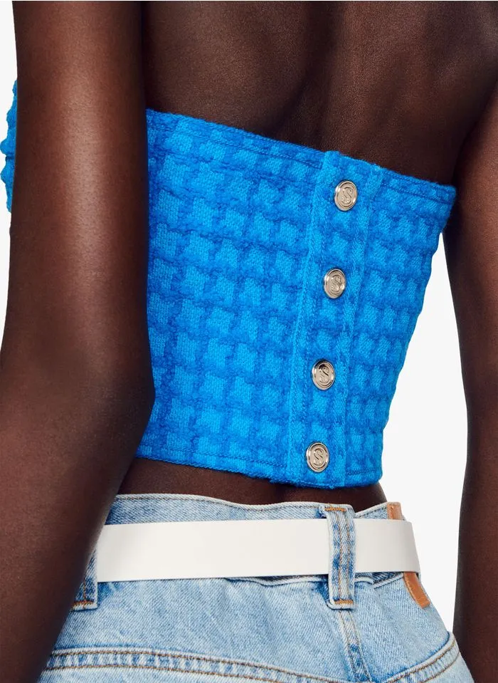 - Bustier court en maille tweed à décolleté c?ur, muni d’une fermeture zippée et de boutons pression au dos.