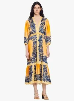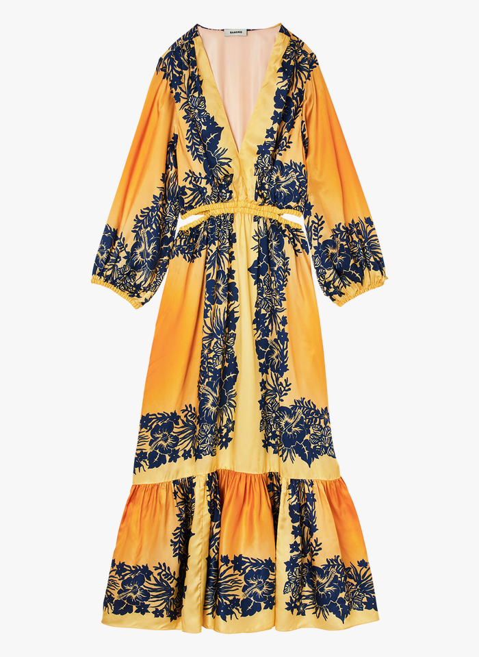 Lange, uitlopende jurk met V-decolleté en print by Sandro voor Dames.